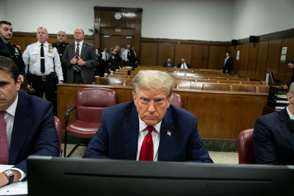 | Image title: NEW YORK, NEW YORK - APRIL 15: Former U.S. President Donald Trump attends the first day of his trial for allegedly covering up hush money payments at Manhattan Criminal Court on April 15, 2024 in New York City. Former President Donald Trump faces 34 felony counts of falsifying business records in the first of his criminal cases to go to trial. (Photo by Michael Nagle - Pool/Getty Images) |