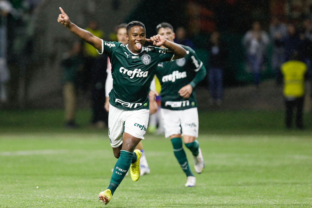 | Image title: SAO PAULO, BRAZIL - NOVEMBER 02: Endrick of Palmeiras celebrate after scoring the fourth goal of his team during the match between Palmeiras and Fortaleza as part of Brasileirao Series A 2022 at Allianz Parque on November 02, 2022 in Sao Paulo, Brazil. (Photo by Ricardo Moreira/Getty Images) |
